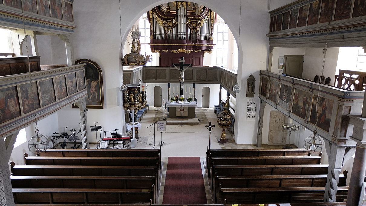 Zu meiner Überraschung ist die zentrale Kirche der Marktgemeinde Heiligenstadt in Oberfranken evangelisch-lutherisch! Eng schmiegt sie sich an/in den Hang. Wer sich als Besucher die jahrhundertealten, engen Holzstiegen zu den beiden oberen »Etagen« ersparen will, geht einfach außen den Hang hinauf und dann von dort ebenerdig hinein. Auch sonst ist das kleine Gotteshaus an Überraschungen nicht arm.